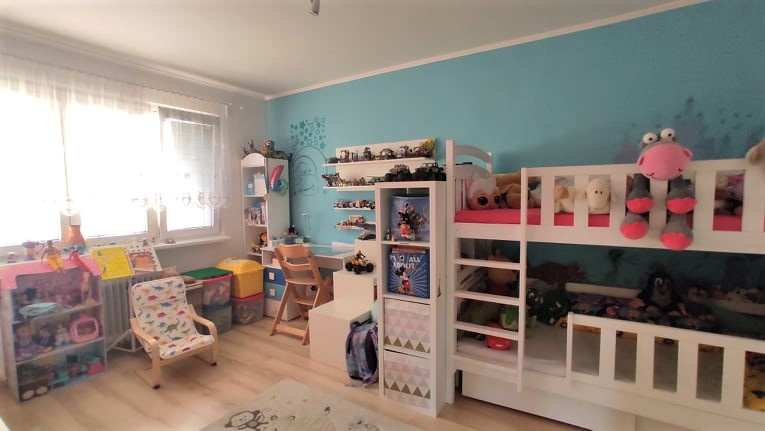 Po vstupu do bytu projdeme předsíní, které dominuje velká vestavěná skříň, jejíž úložné prostory jistě oceníte. Z předsíně se vstupuje na wc a do koupelny - bytové jádro je zděné a prostory jsou odděleny. Další vstup je do kuchyně, pak ložnice - samostatný neprůchozí pokoj s velkou vestavěnou skříní a nakonec do obývacího pokoje, který je natolik velký, že se do něj vejde jak jídelní kout, tak i prostorná sedací souprava a pracovní kout s PC. Z obývacího pokoje je vstup do dětského pokoje, nyní pohodlně pro dvě děti.