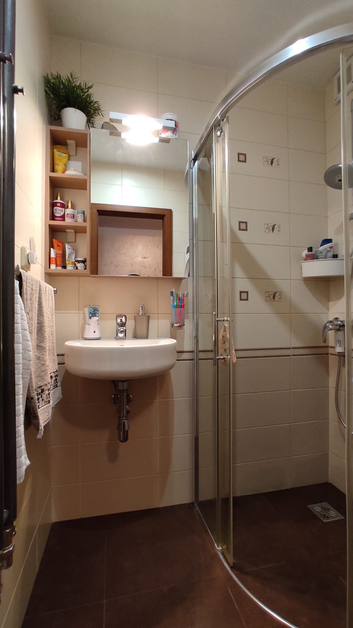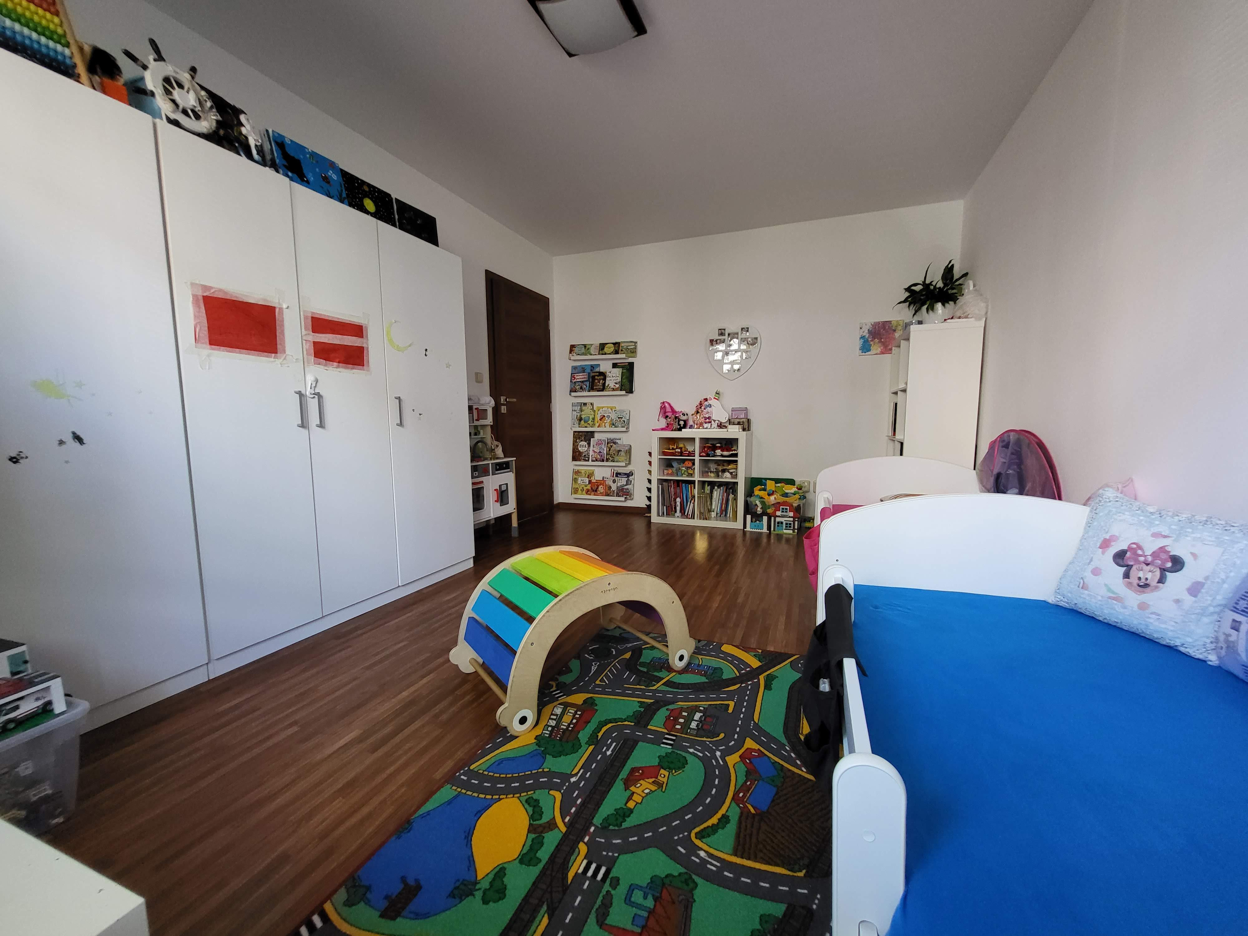 Jádro bytu je zděné a zvětšené. Toaleta je umístěna samostatně, WC mísa je závěsná a praktická skříňka slouží pro úschovu úklidových či hygienických potřeb. V koupelně se nachází nadstandardně prostorný sprchový kout (možno přebudovat na vanu), vedle kterého je ještě prostor pro pračku, sušičku, a také umyvadlo, pod které je možné instalovat koupelnovou skříňku dle vlastních potřeb. Součástí vybavení koupelny je zrcadlová skříňka, která nabízí další úložné místo. V kuchyni je poctivá kuchyňská linka vyrobená na míru se spoustou úložného prostoru, zabudovanou digestoří, varnou deskou, elektrickou troubou, myčkou nádobí, lednicí s mrazákem. V rohu kuchyně je umístěn jídelní stůl se 2 židlemi. Vedle kuchyně je ložnice, dostatečně prostorná pro širší manželskou postel, skříně na míru, pracovní stůl s PC a knihovnu. Vedle ložnice je prostorný obývací pokoj s téměř 7 metry na délku, kde se nachází i malý balkonek. Vejde se zde pohodlně jídelní část s velkým stolem pro celou rodinu a společenská část se sedačkou a ostatním nábytkem. Dětský pokoj je také velmi prostorný, vejdou se zde bez problémů 2 postele, velké skříně a spoustu hraček. Chodba je dostatečně prostorná, je v ní mnoho místa i pro vestavěné skříně. Díky současnému dispozičnímu řešení jsou jednotlivé místnosti dostatečně oddělené a obyvatelé se vzájemně neruší.