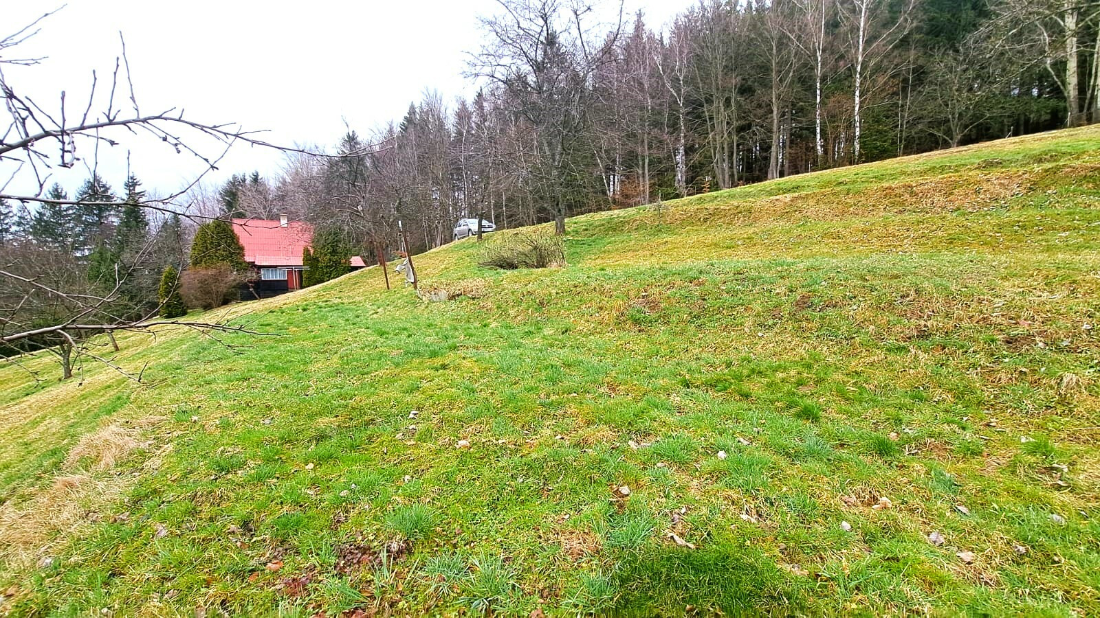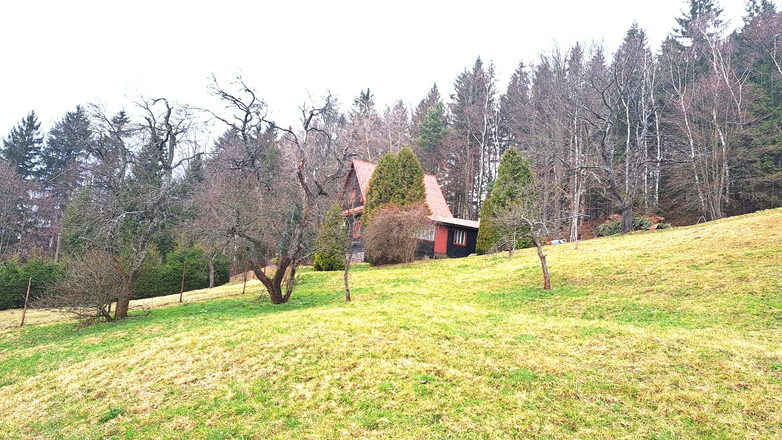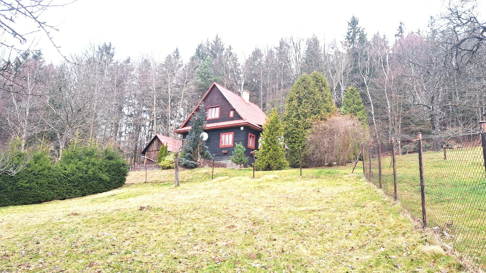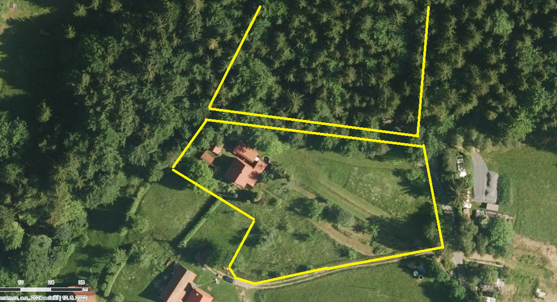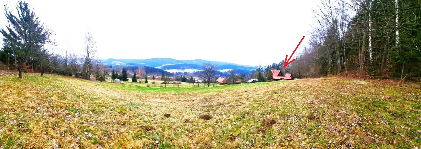 Prodej roubenky s číslem popisným a krásným výhledem, pár minut od centra obce, v nadmořské výšce 615 m.n.m. Celková plocha pozemku 10.945 m2, z toho vzrostlý smrkovo-bukový les 6.043 m2, udržovaná oplocená zahrada 4.772 m2 a zastavěná plocha 130 m2. Územním plánem obce je polovina zahrady určena k výstavbě, možnost zastavět až 800 m2. Pozemek je orientován na jižní stranu, horní část a les jsou mírně svažité, spodní část je členěna na větší terasovité plochy, kde stávala původní chalupa s hospodářskými budovami.