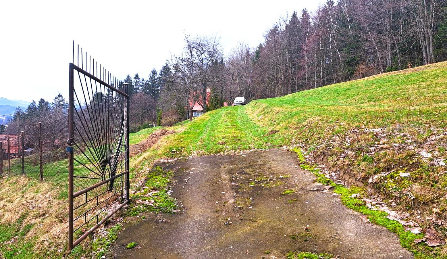 Příjezd po obecní asfaltové cestě, vjezd na pozemek zpevněný. Oplocení je klasické, pletivo se železnými sloupky. Zahrada a zastavitelná plocha jsou v jednom celku, lesem prochází zmíněná obecní cesta, která je po 450 metrech ukončena zákazem vjezdu a pokračuje dál jako lesní. Možnost vjezdu na pozemek také z boční cesty ve spoluvlastnictví prodávajícího.