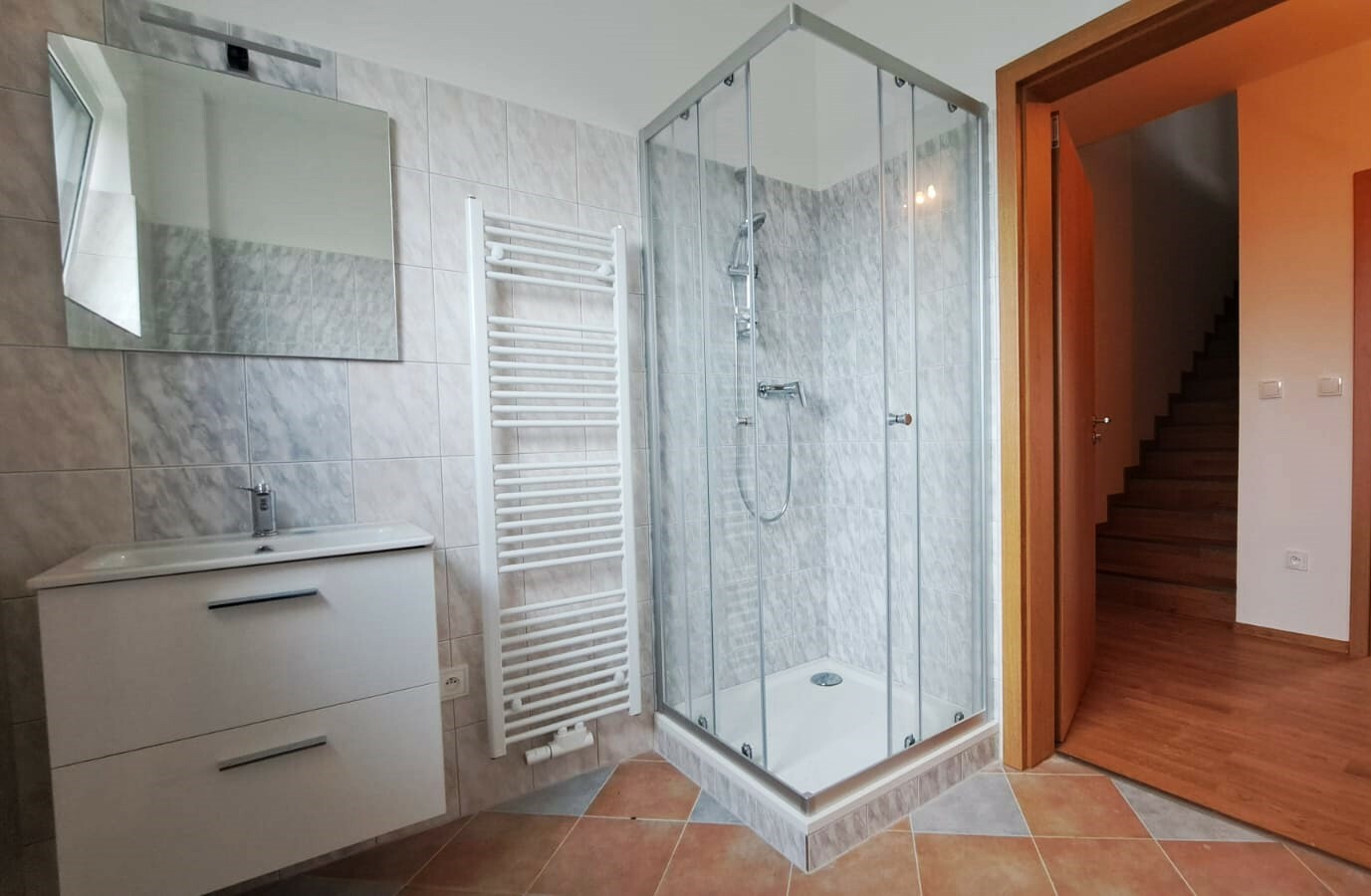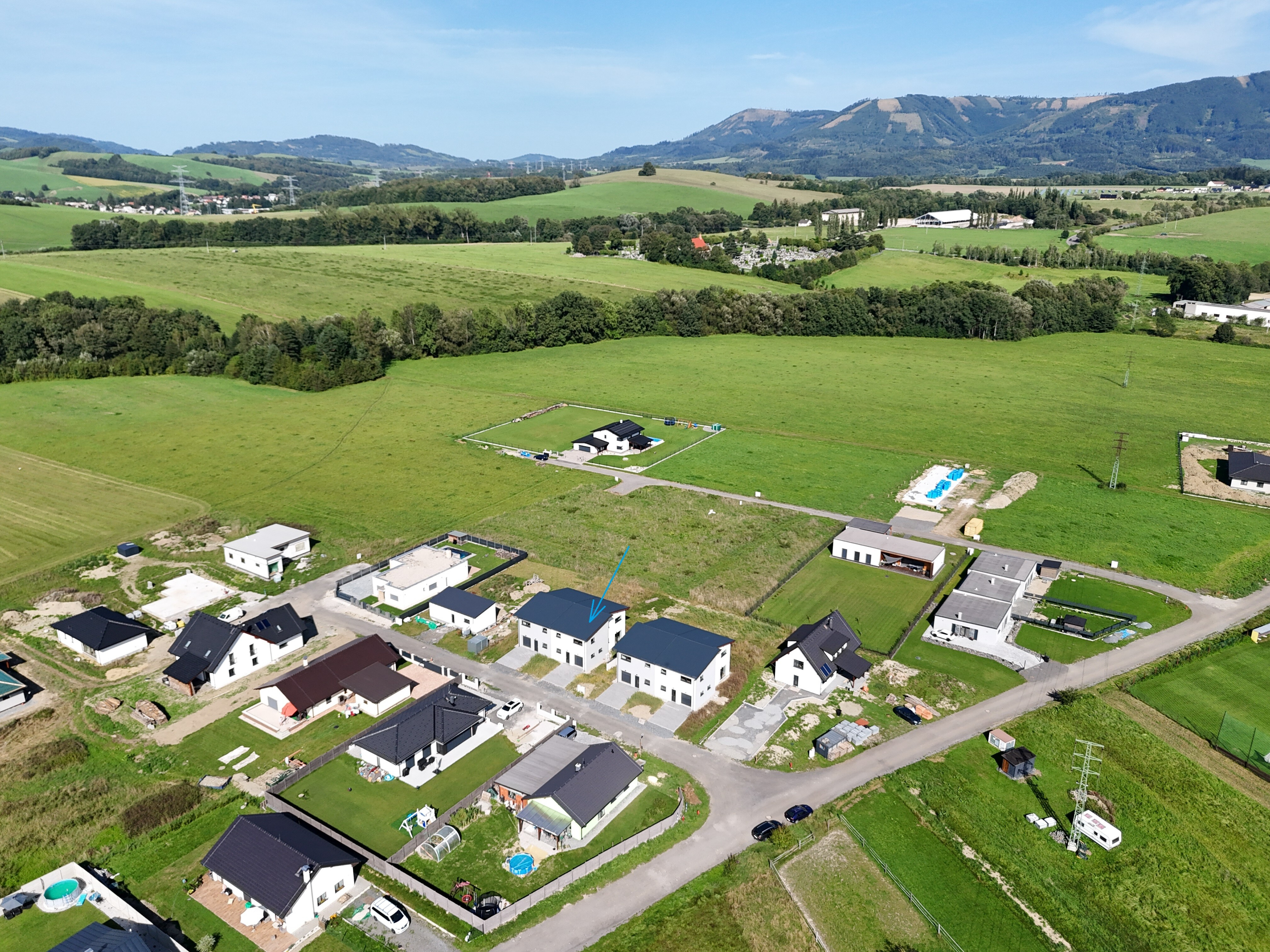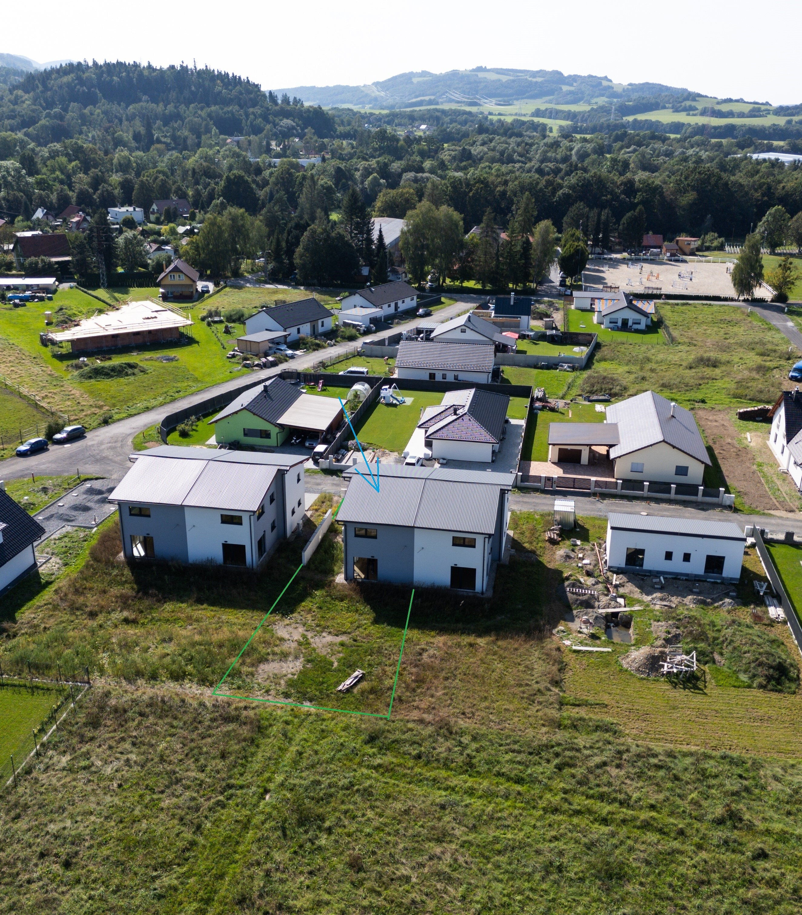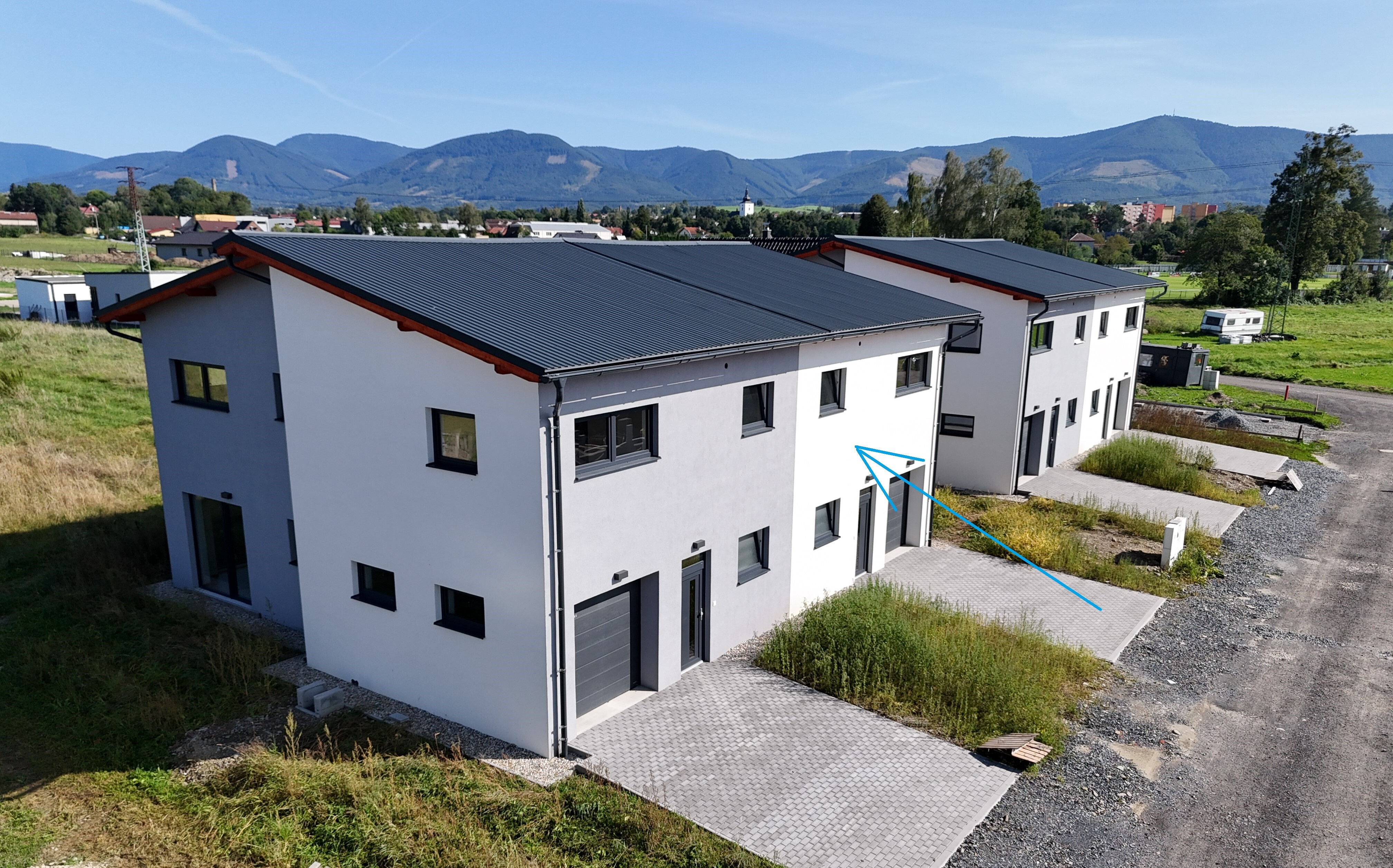 Prodej novostavby rodinného domu v blízkosti centra města. Celková plocha pozemku 428 m2, z toho zastavěná 95 m2. Stavba je dvoupodlažní, nepodsklepená, zateplená. Byly použity standartní moderní materiály a prvky (plastová okna s izolačními trojskly, střešní krytina plech s trvanlivou povrchovou úpravou, rozvody elektřiny a topení v mědi, rozvod internetu a TV po domě), včetně tepelného čerpadla vzduch-voda značky De Dietrich s intuitivní termoregulací – v zimě topí, v létě chladí. Stavba je napojena na veřejný vodovod a kanalizaci, na pozemku se také nachází retenční nádrž na dešťovou vodu. Jednou zdí přiléhá k sousednímu domu, ale zeď není společná a v meziprostoru se nachází protipožární izolace. Přízemí domu se skládá z prostorného obývacího pokoje spojeného s kuchyňským koutem, koupelny s wc a sprchou, garáže, technické místnosti, komory a vstupní chodby. Z obývacího pokoje vedou na zahradu dvoje velké prosklené dveře a světlo dodají velkoplošná okna. Garáž má vrata na dálkové ovládání. V patře najdeme tři neprůchozí ložnice a druhou koupelnu, také se sprchovým koutem, wc a umyvadlem. Ze zahrady a některých pokojů je pěkný výhled na okolní hory. Podlahová plocha domu 180 m2. Dům je zkolaudován v listopadu 2024. Kuchyňská linka nebude instalována. Zahrada je upravena a oseta trávníkem. S financováním mohu pomoci.