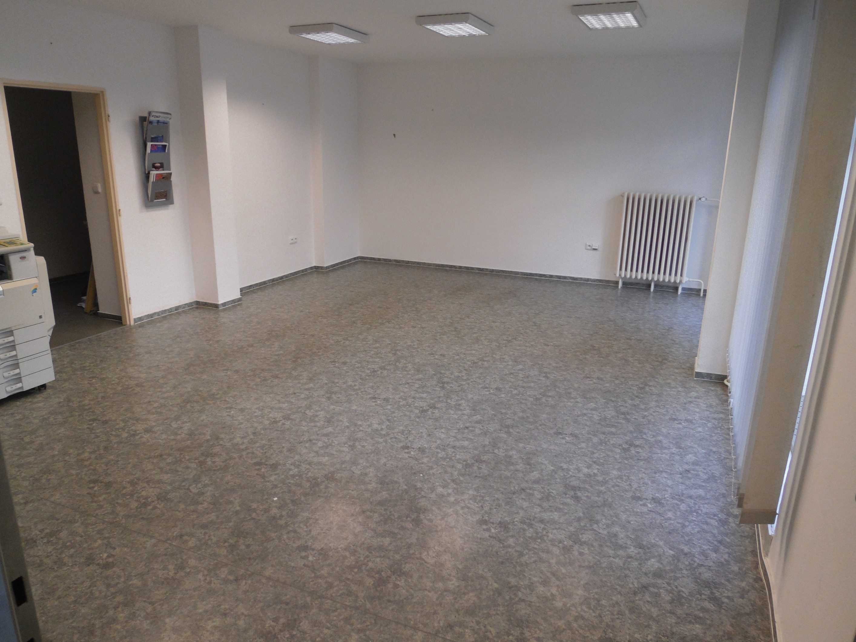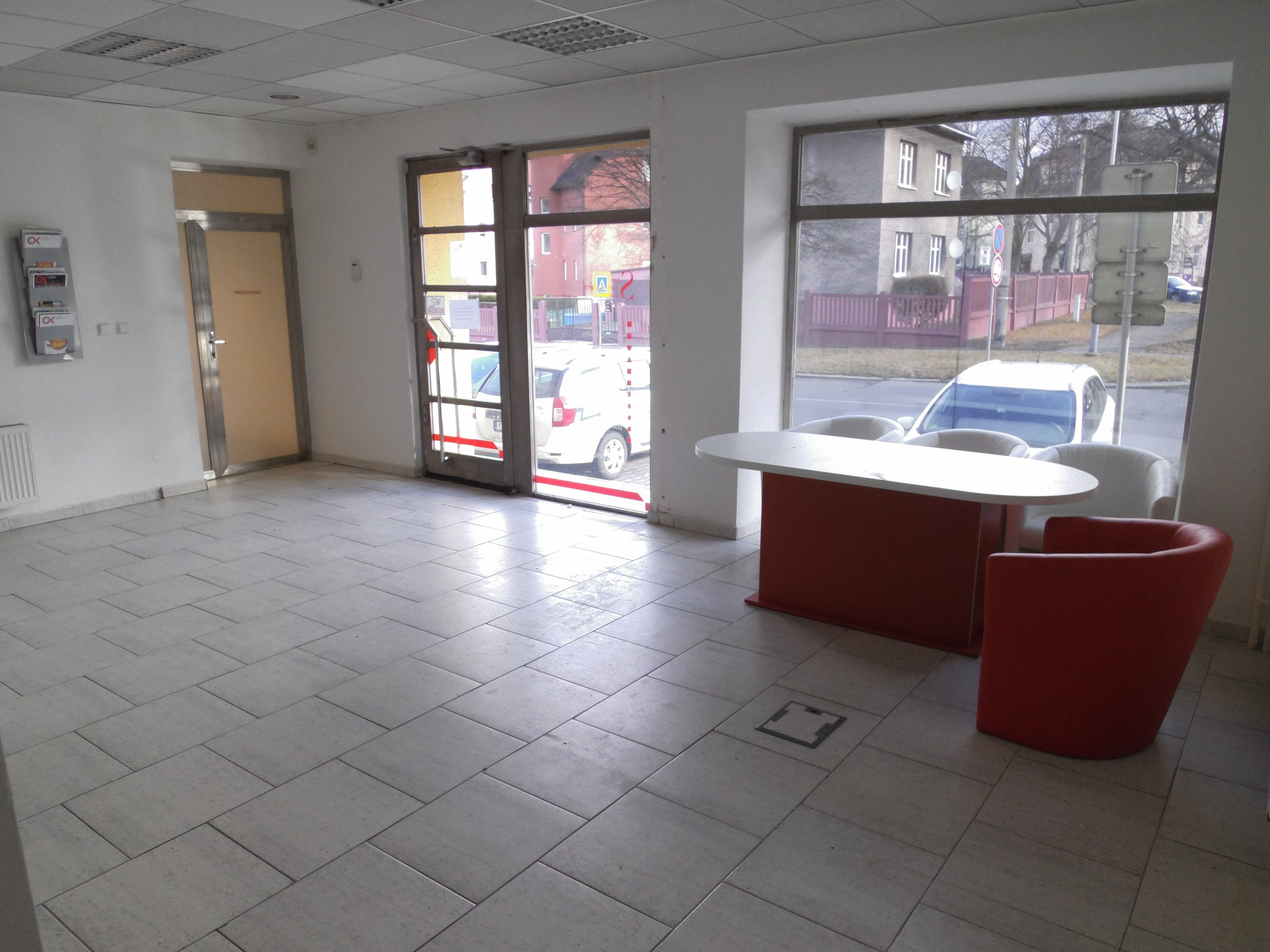 Prostory jsou čisté, bez zařízení, zdi vymalovány bílou barvou. Velké prosklenné výlohy jsou zastíňovány vertikálními žaluziemi.