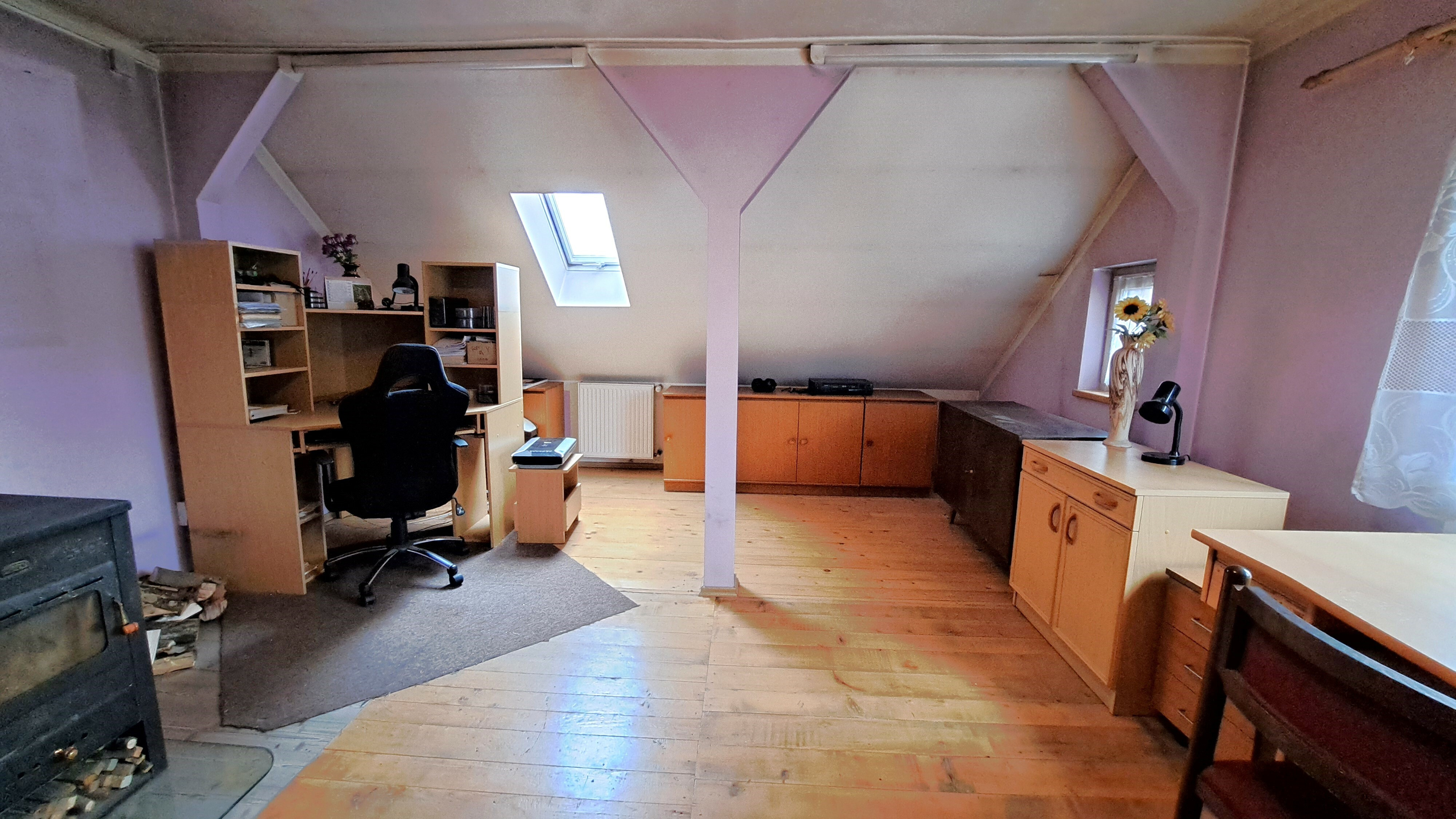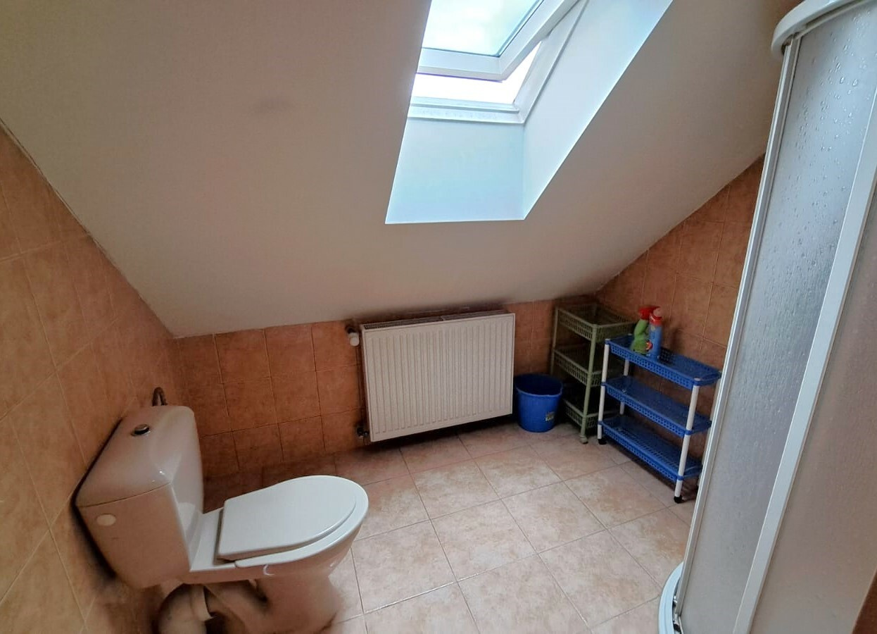 V přízemí domu se nachází vstupní veranda, koupelna s vanou, samostatné wc, kuchyň a dvě neprůchozí ložnice. Technická místnost s kotlem a zásobníkem má samostatný vchod zvenku a je v ní dostatek prostoru na odkládání dalších věcí nebo zásobu dřeva. Do podkroví vedou dřevěné schody, které ústí ve velké čtvercové chodbě. Dále zde najdeme prostorný pokoj s krbovými kamny, koupelnu s wc a sprchovým koutem, další kuchyň spojenou s posezením, malou ložnici s východem na balkon a v šikmé části pod střechou místnost vhodnou např. na šatnu, knihovnu, apod. Vnější části domu nevyžadují rekonstrukce, v interiéru jsou potřeba malé opravy, údržba. Vše je funkční, stavba se temperuje. Na pozemku se nachází ještě samostatná dřevěná dílna na betonovém základu, nejspíše určená ke generální opravě nebo zbourání.